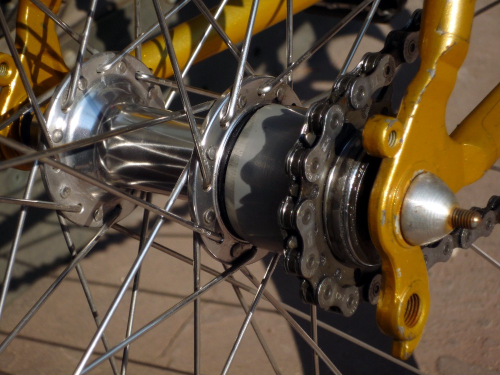 Das Thema Freilaufritzel ist eine Sache für sich, die billigen Dicta sind ungedichtet und relativ ungenau gefertigt. Genau so die von ACS, nur dass die ärgerlicher Weise auch noch teurer sind. Mit solchen Teilen macht Singlespeed kein Spaß. Zumal diese Mistdinger auf einer wunderschönen Surly Nabe saßen. Das White Industries - ENO Trial ist das einzige Ritzel, das länger hält, was man von einem Ritzel, das um 100€ kostet auch erwarten kann. Leider sind die Sperrklingen von Werk aus so laut, dass man keine Klingel mehr braucht. Einmal den Rücktritt gedreht, weiß jeder im Umkreis von 50m, dass ein Fahrrad kommt. Mich hat es irgendwann so genervt, dass ich wieder eine Rennradnabe, Shimano Ultegra, eingespeicht habe. Auf den Fotos kann man so ein graues Rohr als Zwischenstück auf dem Freilauf sehen. Das ist ein 50mm HT-Rohr für Abwasser, die gibt es billig aus dem Baumarkt. Das Rohr hat leider ein klein wenig Spiel auf dem Freilauf, also habe ich zwei Lagen Gaffa um den Freilauf gewickelt. Dann kommt ein normales Singlespeed Steckritzel drauf und zum Schluss habe ich das kleinste Ritzel aus einer Kassette zum verschrauben auf den Freilauf gesteckt, das mit der Rasterung auf der Außenseite. Das verhindert zuverlässig, das sich die Konstruktion löst. Der Optik wegen habe ich die Zähne bei dem (Kassetten)Ritzel abgeflext. Beim Zuschnitt des HT-Rohres ruhig 2mm dazu rechnen, damit man nachher beim Zusammenschrauben ordentlich Druck geben kann.