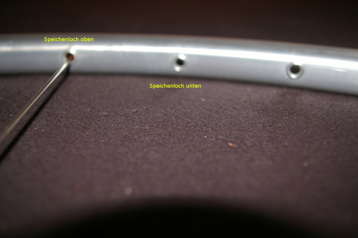 Mit der ersten Speiche fängt alles an und die sollte mit bedacht montiert werden, denn schon jetzt lauert der erste Fehler. Wenn man die Speichenlöcher in der Felge genau betrachtet, so wird man feststellen, dass sie leicht versetzt sind(Bild 1). Sie sind so angeordnete, dass jeweils ein Nabenflansch eine Lochreihe bedient.
