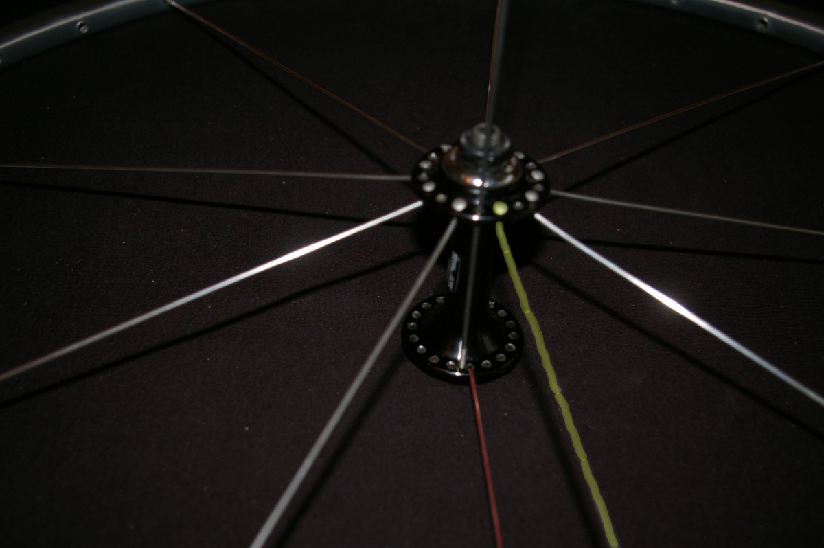 Wieder ist die erste Speiche von Bedeutung. Zunächst sind die Speichen noch sehr locker, wenn man an der Nabe dreht, wie in den Bildern 10 und 11, kann man die Speichen auf Spannung bringen. In diesen Moment entscheidet sich auch wie viele Speichenkreuzungen ich real bekomme. Bei einer üblichen Dreifachkreutzung wie auf Bild 12 zu sehen ist sollte die Speiche gerade bis zum Speichenloch reichen. Ist sie länger einfach vier Löcher nach links und man hat eine Vierfachkreutzung. Sollte sie zu kurz sein, vier Löcher nach rechts und man bekommt eine Zweifachkreuzung. Beim anlegen der ersten Speiche ist immer darauf zu achten, dass die restlichen Speichen leicht auf Spannung bleiben. Sollte die Länge der Speiche genau zwischen zwei Löchern liegen, dann würde ich das Loch empfehlen, bei der die Speiche ein wenig zu kurz ist.