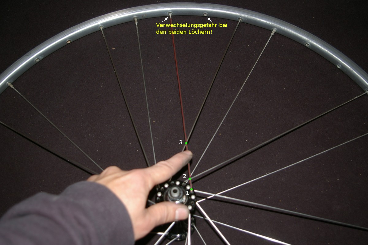Als ich vor Jahren meine erste Felge eingespeicht habe, gab es im Internet noch relativ wenig Material über die Technik. Also habe ich mir die Speichung von einem fertigen Rad angeschaut und nach gebaut. Dabei haben sich einige Fehler eingeschlichen, was ärgerlich war, denn bemerkt hatte ich die Fehler erst, wenn das Rad irgendwie unrund lief. Also wieder runter mit den Speichen und neu angefangen. Mit der Zeit habe ich ein Vorgehensweise entwickelt, die Fehler vermeidet oder sie schnell aufdeckt. Dabei ist es egal ob es sich um 28, 32 oder 36 Löcher handelt, oder ob man 2,3 oder 4 mal kreutzen möchte. Das Schema ist immer das Selbe.