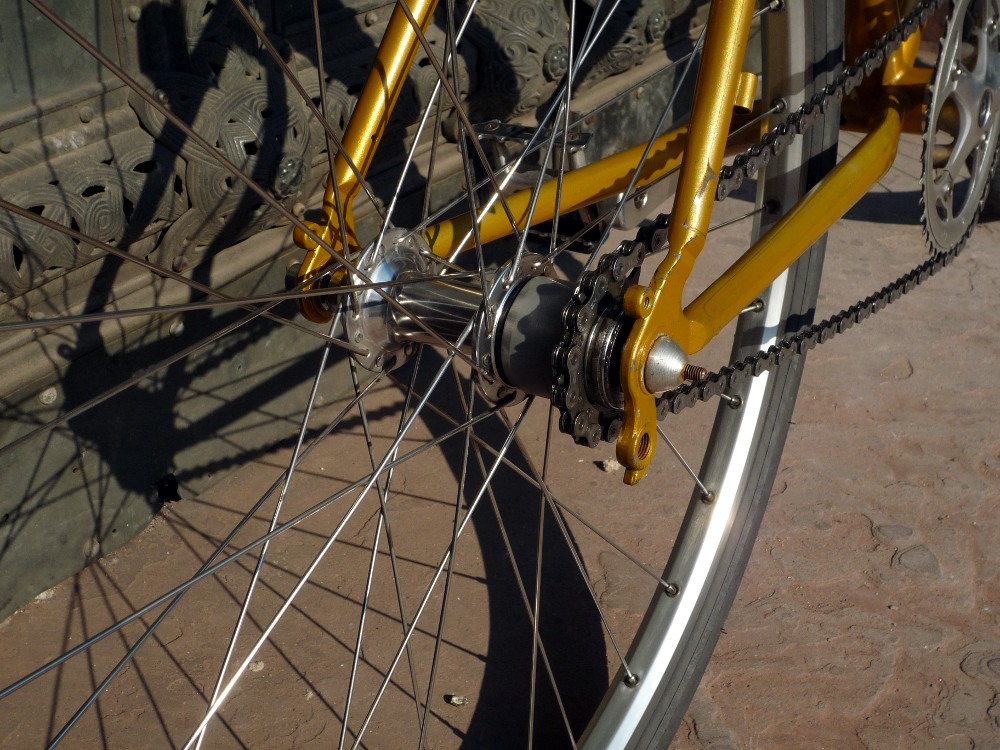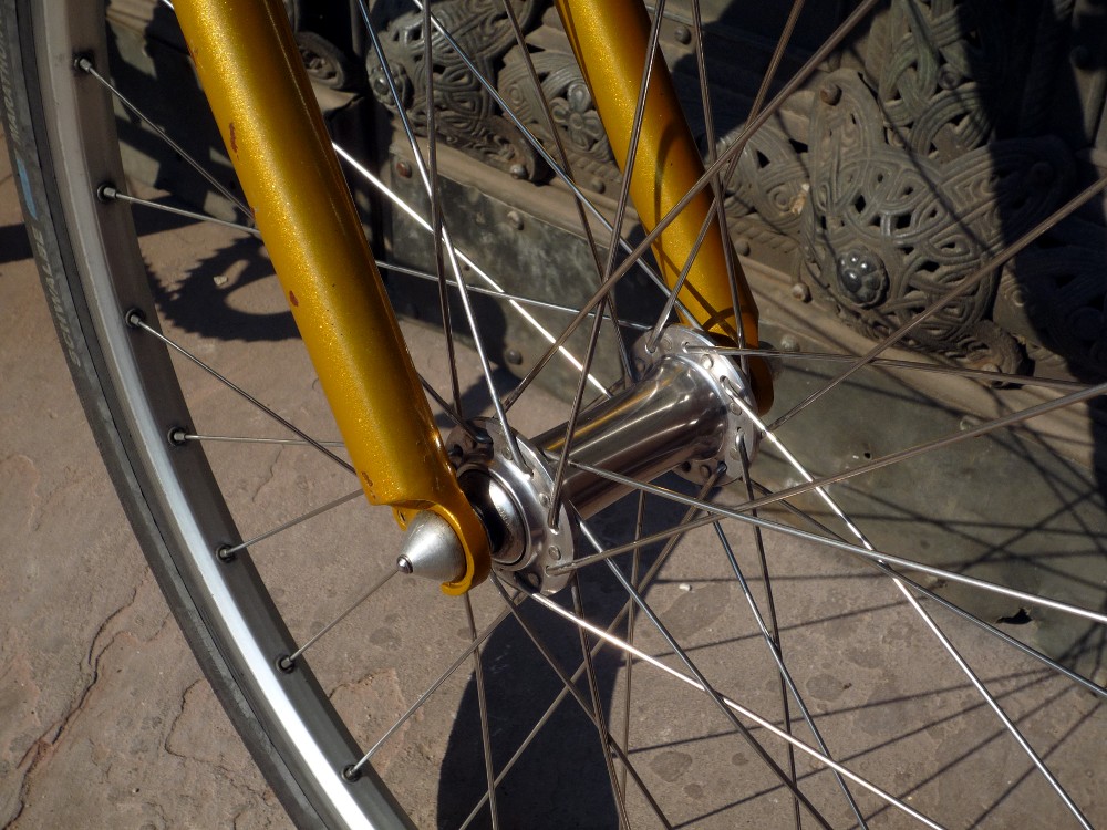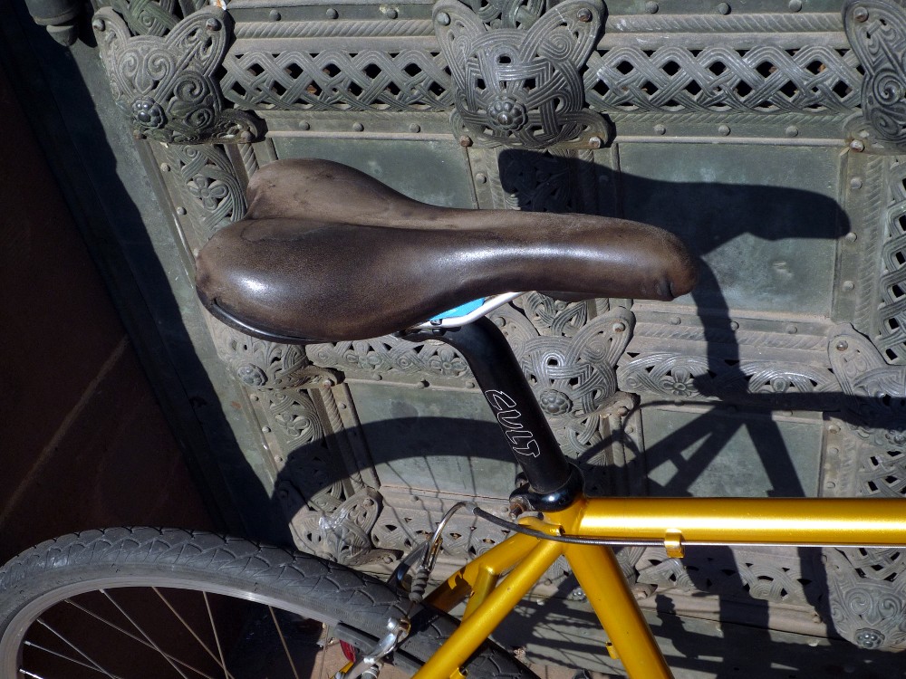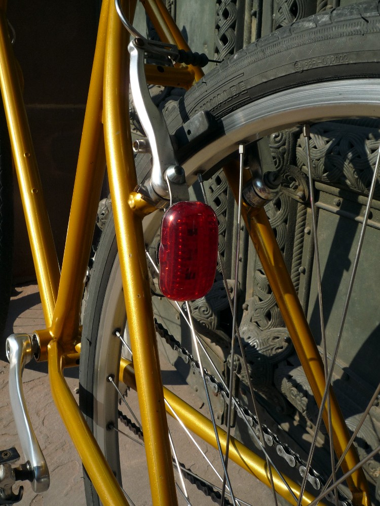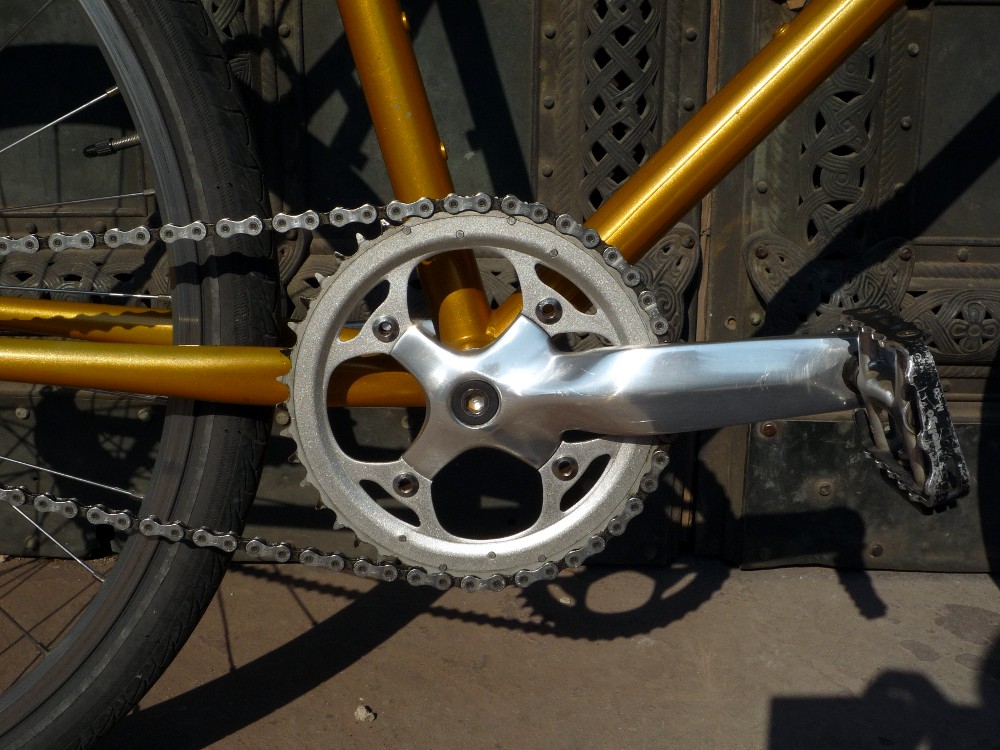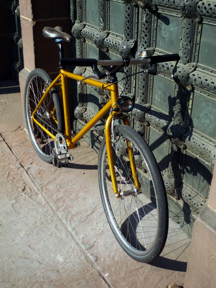 Angefangen hat alles mit dem Rahmen mit Gabel, den ich für wenig Geld bei Ebay ersteigert habe. Auf einem kleinen Label am Rahmen stand 'Tange – cromo'. Die Lackierung war schon etwas lediert und hat mir gar nicht gefallen, blau-grau-metallic. Also habe ich den Rahmen chemisch entlackt und neu lackiert. Unter dem Lack erschien eine Prägung auf den Oberrohr, 'Tange Pestige'. In den 90er ein absoluter Top-MTB-Rohsatz. Zuerst hatte ich ein dunkelgrün drauf, mittlerweile ist er gelb-metallic. Weil meine eigenen Lackierungen erfahrungsgemäß nicht so gut halten, habe ich diesmal einen transparente Klebefolie über die wichtigsten Stoßstellen geklebt. Das war eine gute Idee, denn die Folie hat schon so einiges abgefangen. Vorn an der Gabel ist sie nicht bis nach ganz unten geführt und man kann einige Lackabplatzer sehen. Der Sattel war mit einen Kevlar-Kunstleder-Bezug bezogen, wobei sich das Kunstleder nach ca. 1Jahr verabschiedet hat.Ich habe ihn dann mit echtem Nappaleder aus einer alten Lederjacke bezogen und das hält jetzt schon fast 10Jahre. Die Beleuchtung hat vorn wie hinten LEDs als Leuchtmittel. Vorn wurden 22 weiße LEDS parallel geschossen und in eine handelsübliche Fahrradlampe gebastelt. Hinten habe ich einen Batterie-LED-Rückstahler auseinander genommen, eine superhelle rote LED und einen großen Elko(1F für Standlicht) eingebaut. An das Rückstrahlergehäuse habe ich einen Aluminiumblechstreifen mit Epoxiyharz geklebt, damit kann man ihn an den hinteren Sockel für die Bremsen montieren.