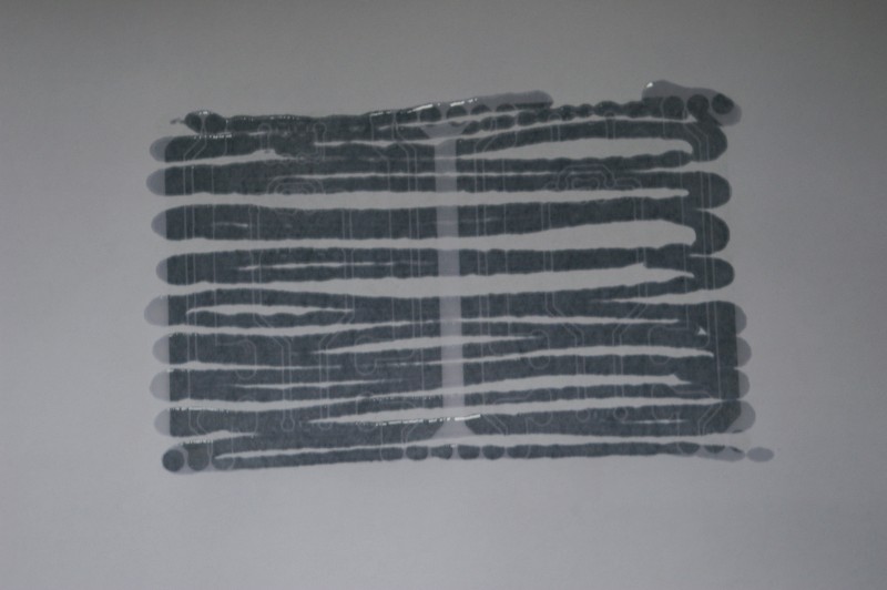 1. Layout mit einem Laserdrucker auf normalen Druckerpapier ausdrucken. Wenn man keinen Laserdrucker hat, kann man auch mit Tinte drucken und anschießend im Copyshop kopieren. Je besser der Ausdruck, desto besser ist auch das Ätzergebniss. Anschießend den Ausdruck/Kopie mit Klarlack beschichten (Verdichten), dafür nehme ich 'Klarlack 70' von Kontakt Chemie(den braucht man eh zur anschießenden Versiegelung der fertig gelöteten Platine). Ca. 1 Stunde trocknen lassen und anschließend die Rückseite dünn mit Nähmaschinenöl einreiben, so dass das Papier transparent wird. Überschüssiges Öl wieder abwischen. Damit kann man schon ausreichend gut Belichten. |