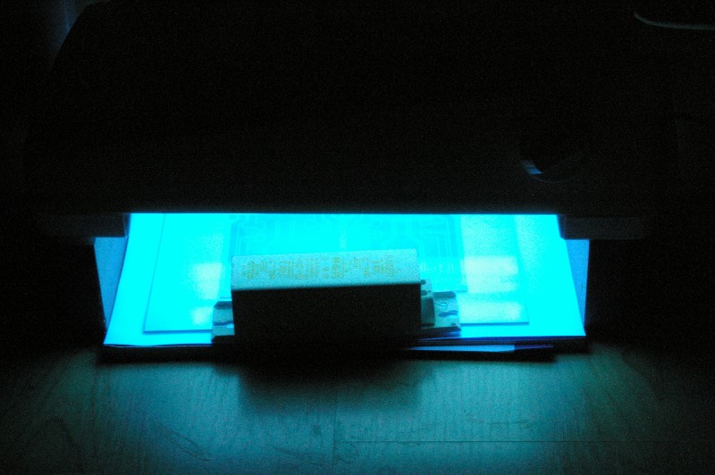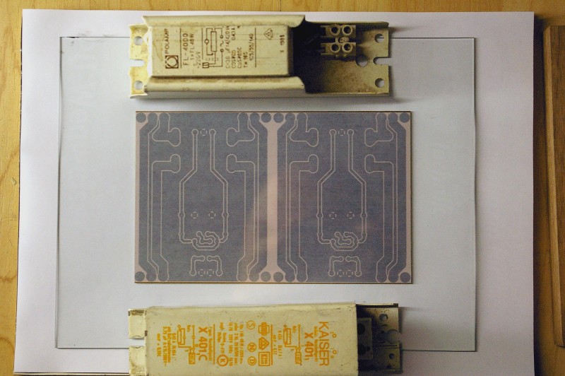 2. Das Belichten habe ich früher mit einer normalen 20Watt Energiesparlampe gemacht. Ca. 10cm Abstand und 45min. Belichtungsdauer. Heute nehme ich dafür einen alten Gesichtsbräuner, der das in gut 7min schafft :) Wichtig ist, dass das Layout sorgfältig positioniert, ganzflächig und mit dem Toner auf der Belichtungsschicht der Platine aufliegt. Ich lege nochmal eine Glasscheibe darüber, die ich seitlich beschwere, so dass das Layout wirklich plan aufliegt. |