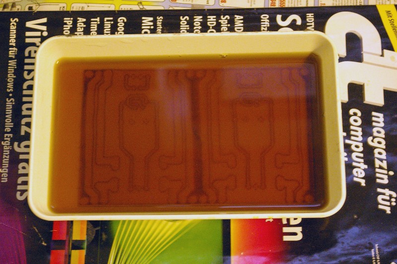 4. Mit Eisendreichlorid lässt sich am leichtesten zu hause in einer Schale ätzen. Die Säure arbeitet auch bei Zimmertemperatur sehr gut. Die Platine in die Schale mit der Säure legen und alle 3min einem Pinsel vorsichtig über die kupferkaschierte Seite streichen. Das ist wichtig und beschleunigt den Ätzvorgang enorm, was wiederum wichtig für feine Ätzstruckturen ist. Wenn man sehr feine Leiterbahnen (0.2mm) braucht, sollte man fortwährend die Platine mit dem Pinsel bearbeiten, das gibt die besten Ergebnisse und geht auch etwa doppelt so schnell. Nach ungefähr 20min. ist die Ätzung fertig. Die Platine wird nun mit Wasser und Spüli gesäubert. |