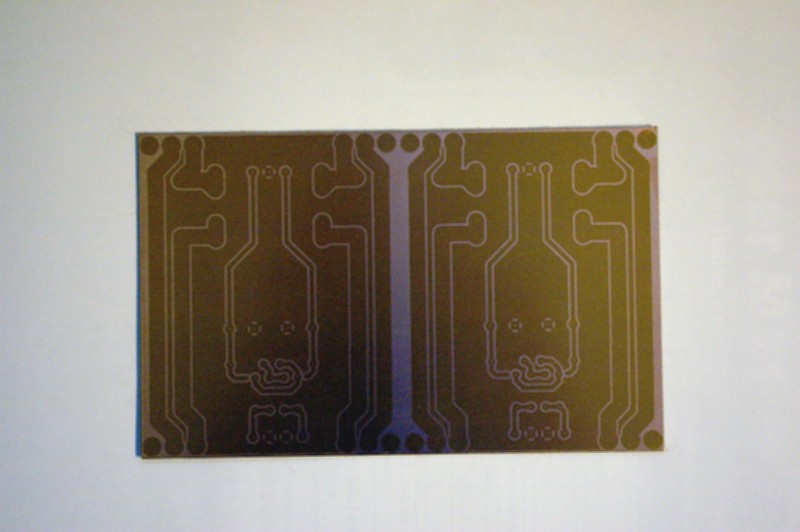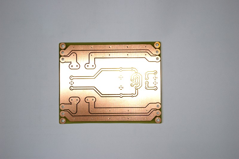 5. Der Restlack auf den Leiterbahnen ist eine guter Oxidationsschutz kann solange auf der Platine verweilen, bis man anfängt zu löten. Die Platine wird jetzt gebohrt. Der Lack lässt sich anschließend mit Nitroverdünnung ablösen. Die Kupferseite der Platine wird nochmal mit Sidol o.ä. poliert und auf Hochglanz gebracht. Das ist wichtig, damit das Kupfer das Lötzinn besser annimmt. Jetzt sollte man vermeiden auf die Kupferseite zu fassen, denn jede Oxidation erschwert das Löten. Die Platine ist jetzt fertig und kann bestückt werden. |