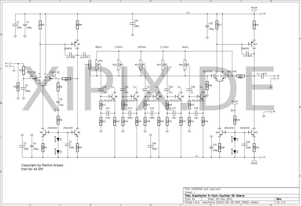 Der EqualizerDa die Vorstufe ohne Opamps hervorragend funktioniert, habe ich auch die Klangregelung diskret aufgebaut. Die Schaltung ist ein einfacher 5-Band-Equalizer, bei der Gyratoren die Induktivitäten nachbilden. Altbewährte Schaltung. Der Eingangsverstärker hat eine Spannungsverstärkung von 3 und der Regelbereich der fünf Bänder umfasst +/-7dB. Viele schaffen hier mehr dB, rauschen aber dafür auch deutlich mehr. Mit +/-7dB kann man schon eine Menge an Soundvariationen raus holen. Der Differenzverstärker ist wieder mit den rauscharmen 2SK170 bestückt. Ebenfalls wie in der Vorstufe finden hier die rauscharmen 2SC2240 und 2SA970 Verwendung. Beim Filterentwurf habe ich bei den Bässen eine geringere Güte eingestellt als bei den Höhen. Dass heißt, wenn der Bassregler betätigt wird, wird ein breiteres Frequenzspektrum angehoben oder abgesenkt. Das ist reine Geschmackssache, wer den Equalizer nachbauen möchte, kann andere Güten und Frequenzen einstellen. |