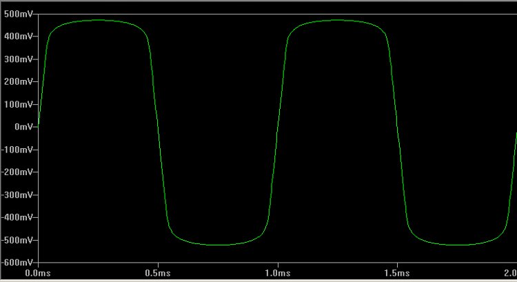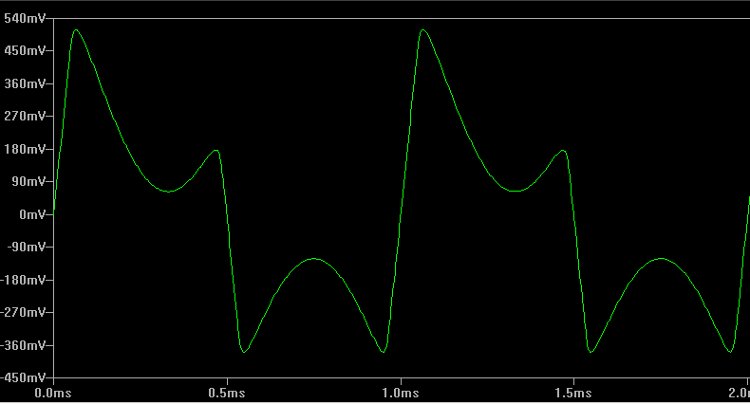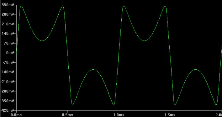 Der Vorverstärker mit ZerreNachdem ich versucht habe das Verhalten von Röhren mit Feldeffekttransistoren zu simulieren und auf kein brauchbares Resultat gestoßen bin, habe ich mich wieder der altbewährten Technik zugewandt, die zuverlässig das Signal mit Dioden begrenzt. Einzig im Eingang habe ich einen Differenzverstärker mit zwei Jfets bestückt, den guten alten 2SK170GR. Ich hätte den Eingangsverstärker auch einfacher mit einem Opamp aufbauen können, aber wegen der Rauscharmut habe ich mich für einen diskreten Aufbau entschieden.Im Eingangsverstärker wird das Signal in der Gegenkopplung begrenzt. Um genug Headroom beim cleanen Spiel zu haben begrenzen die Zenerdioden mit den LEDs erst bei ca. +/-12,5V. Die Begrenzung geschieht sehr sanft und das Signal wird über das Poti RV1 (Volume 1) über das Relais an den 5-Band Equalizer geschaltet. Für die Zerre habe ich mir etwas Besonderes einfallen lassen. Wenn der Poti RV 4 (Tubemachine) 0 Ohm hat, dass heißt er ist geschlossen, begrenzen Q7/9 das Signal wie normale Dioden(Bild 2a), die Stromspiegel werden quasi kurzgeschlossen. Wird der Potis geöffnet geschieht im Prinzip genau das, was bei der Röhrenverzerrung auch passiert. Durch Spiegelung der Signalamplitude in den Spitzen werden zusätzlich Obertöne dazu gemischt (Bild 2b). Das ist einem Oktaver nicht unähnlich. Mit Poti RV 3 (snot) kann man Q7 mit einem Höhensignal ansteuern, so dass bestimmte Signalanteile nicht mit den Obertönen überlagert werden (Bild 2c). Das klingt dann ein wenig Rotzig, deswegen der Name. Das ist keine technisch genaue Schaltungsbeschreibung, erklärt das Prinzip aber auf einfache Weise. Der Elektroniker wird den Schaltungstrick erkennen ;) |