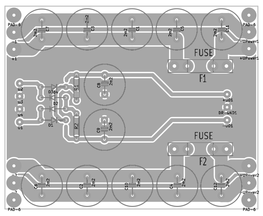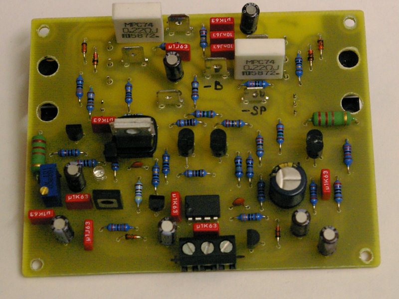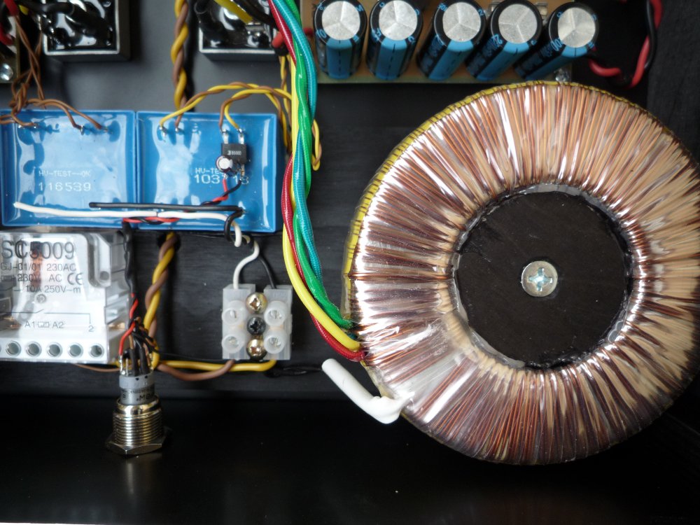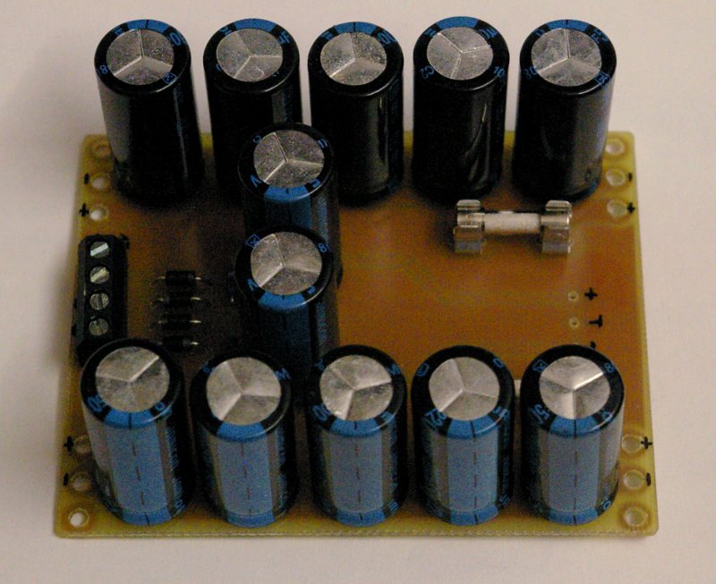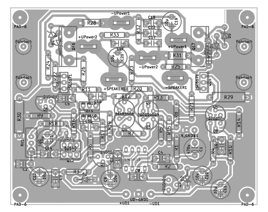 Netzteil: Das Netzteil besteht ebenfalls aus einer 100mm x 80mm großen Platine. Darauf sind Siebung für Endstufen und Spannungsverstäker(UD). Der Gleichrichter für den Spannungsverstärker ist mit auf der Platine, als Dioden verwende ich die fast recovery Typen UF4003. Die beiden Brückengleichrichter für die Endstufe sind nicht auf der Platine, ich verwende die großen 35A-Typen, die an das Geäuse geschraubt werden. |
