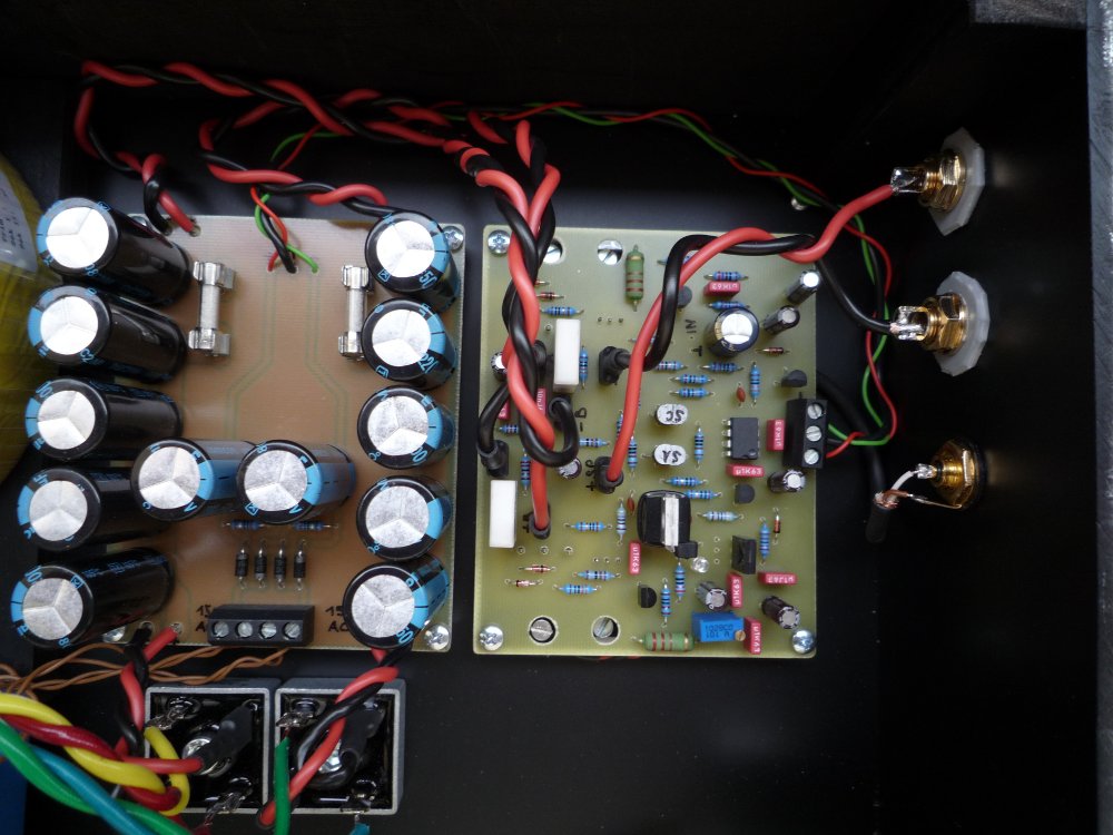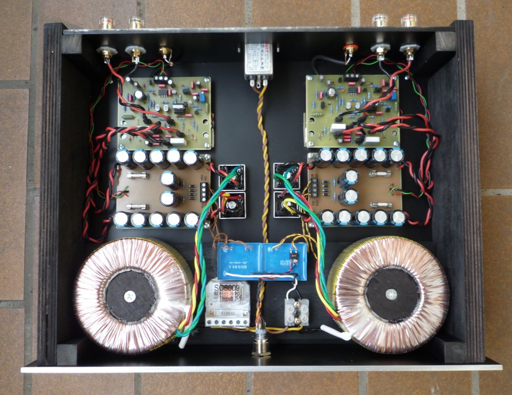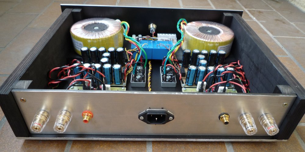 Zum Schluss noch ein paar Bilder vom Aufbau im GehäuseDas Gehäuse besteht aus Aluminium und Holz. Boden, Rück- und Frontplatten bestehen aus 5mm starken Platten. Das lässt sich noch gut mit der Stichsäge bearbeiten. Die Seitenteile bestehen aus 20mm Multiplex, die ich dunkel gebeizt habe. Den Innenraum habe ich mattschwarz lackiert, weils schöner aussieht. |