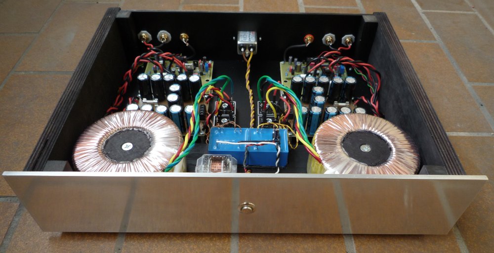 Bilder vom fertigen Verstärker Beschreibung: Als nächstes Projekt schwebt mir ein Audio-Verstärker mit High-End Qualitäten vor. Mich hat das Prinzip des Circlotrons schon immer fasziniert und so habe ich mit LT-Spice eine Schaltung entwickelt, die gerade wegen seiner Schlichtheit besticht.Ein Circlotron ist im Prinzip ein Brückenverstärker, bei dem jeweils ein End-Transistor im sog. „single endet“ Modus arbeitet. Es bietet sich an den Arbeitspunkt der einzelnen Transistoren so zu wählen, dass sie jeweils im Class AB-Betrieb laufen. Durch das schwimmende Netzteil werden dann beide Halbwellen wieder zusammengesetzt. Es klingt kurios, aber jeder Endtransistor für sich betrachtet arbeitet im reinen Class A-Betrieb und das sogar bis zur Leistungsgrenze! Allerdings wird der Arbeitspunkt so gewählt, dass jeweils nur eine Halbwelle verarbeitet wird. Erst durch den Brückenbetrieb werden die jeweiligen Halbwellen wieder zusammengesetzt. Das hat deutliche Vorteile gegenüber komplementären Endstufen. So gut moderne Endtransistoren heutzutage auch sein mögen, völlig komplementär sind sie nie. Deswegen gibt es immer noch Lösungen bei denen der Verstärker in Class-A arbeitet. Und die ganz große Schule, der audiophilen Zunft, bevorzugt sogenannte „single endet“ Endstufen, dass heißt, es kommt nur ein Typ von Transistoren zum Einsatz. Wegen der Verfügbarkeit sind das meist N-Kanal-Typen, die dann gegen eine Konsantstromquelle in Class-A arbeiten. Ein Circlotron arbeitet ebenfalls nur mit einer Sorte von Transistoren mit jeweils der gleichen Kennlinie. Nachteilig bei einem Circlotron ist, dass man pro Endstufe einen Trafo mit zwei unabhängigen Wicklungen braucht. Dafür lassen sich dann aber auch Leistungen mit mehreren hundert Watt realisieren. Um das in Class-A umzusetzen, bräuchte man Waschmaschinen große Endstufen, allein wegen der Kühlung... Meine Schaltung besteht aus einem dreistufigen Spannungsverstärker, der eine über-alles Spannungsgegenkopplung besitzt. Die Endstufe arbeitet im invertierten Modus, das bedeutet, dass der Eingang relativ niederohmig ist. Bei meiner Schaltung sind es 680 Ohm. Moderne Vorstufen sollten damit eigentlich keine Probleme haben, aber sicherheitshalber habe ich einen Impedanzwandler eingebaut und so einen hochohmigen Eingang der Endstufe gewährleistet. Mit dem LME49710 habe ich einem Opamp gewählt, der bezahlbar ist und bestechend gute Werte hat. 680 Ohm treibt er ohne Probleme und weil der Offset so gering ist, läuft die (eigentliche)Endstufe im DC-Betrieb. Nur vor dem Opamp ist ein Koppelkondensator vorgesehen. Wer sich sicher ist, dass sein Vorverstärker Gleichspannungsfrei ist, kann an dieser Stelle eine Brücke setzen. Jetzt könnte man denken, „hey, mein Vorverstärker treibt die 680 Ohm locker. Also lass ich auch den Opamp weg“. Das würde ich nicht unbedingt empfehlen, denn vor dem Opamp wird die Grenzfrequenz der Endstufe eingestellt. Das ginge zwar auch im invertierten Eingang, hat jedoch einen kleinen Nachteil im Rechteckverhalten der Endstufe. Der invertierte Modus hat auch den Vorteil, dass es weniger Gleichtacktverzerrungen gibt und dass keine Masseströme fließen. Das Layout ist somit etwas unkritischer in diesem Bereich. Nach dem Opamp folgt ein Differenzverstärker, wobei die einzelnen Transistoren als quasikomplementäres Pärchen, auch CFP genannt, verschaltet sind. Somit bekomme ich einen sehr linearen, in sich gegengekoppelten Transistor mit einer hohen Stromverstärkung. Die Spannungsverstärkung des ersten Differenzverstärkers liegt etwa bei 214. Darauf folgt ein zweiter Differenzverstärker, der aus zwei P-Kanal-Mosfets besteht und eine Spannungsverstärkung von etwa 180 hat. Das Signal trifft nun wiederum auf einen Impedanzwandler in Form von einem N-Kanal-BJT-Transistor. Der sorgt für einen niederohmigen Übergang an die Leistungsmosfets. Das funktioniert sogar so gut, dass man ohne Probleme einen Gatewiderstand von nur 10 Ohm nehmen kann. Im Gegenteil, der geringe Gatewiderstand hat hier sogar Vorteile im Hochfrequenzverhalten der gesamten Endstufe. Also bloß nicht erhöhen! Der Leistungsmosfet bringt auch noch eine Spannungsverstärkung mit, die allerdings von der Impedanz des Lautsprechers abhängig ist, also nicht eindeutig bestimmbar. Je höher der Ausgangswiderstand, desto höher die Leerlaufverstärkung und desto besser ist die Kontrolle. Für die Resonanzfrequenz des Basstreibers bedeutet das einen sehr hohen Gegenkopplungsfaktor in diesem Bereich, woraus ein sehr kontrollierter Bass resultiert. Der Ausgang der Endstufe erfolgt an den Sourcen der Mosfets, ähnlich wie bei einer Röhrenendstufe. Eigentlich spricht man dann von einem Transkonduktanzverstärker mit hochohmigen Ausgang. Aber durch die Gegenkopplung und die Eigenschaften des Mosfets ist der Ausgang der Endstufe trotzdem äußerst niederohmig. Ob es sich dabei dann immer noch um einen Transkonduktanzverstärker handelt, darüber lässt sich trefflich streiten, so geschehen in verschiedenen Foren. Wie dem auch immer sei, der Verstärker klingt exzellent. Die Bauteile sind dem entsprechend sorgfältig gewählt und gepaart. Im Eingang findet sich das CFP-Pärchen, aufgebaut aus gematchten 2SC2240GR und 2SA970GR. Dann zwei P-Kanal-Mosfets, bestehend aus den äußerst linearen IRF9610, ebenfalls gematcht. Und zum Schluss kommen die Treiber in Form von zwei 2SC5171. Die Leistungsmosfets sind auch gematcht und bestehen aus den allseits beliebten IRFP140N. Die Mosfets sind auf Ugs gematcht und die BJTs auf Hfe. Nachdem ich verschiedene Messungen gemacht habe, ist mir aufgefallen, dass Ruhestrom und Offset am Ausgang leicht schwanken, nichts Dramatisches und wahrscheinlich verursacht durch die DC-Kopplung des Verstärkers. Das änderte sich als ich den Gleichspannunganteil mit Kondensatoren abgekoppelt hatte. Jetzt wird es problematisch, wenn man den Einganwiderstand gering halten möchte braucht man sehr große Kapazitäten. Gegen Elkos al